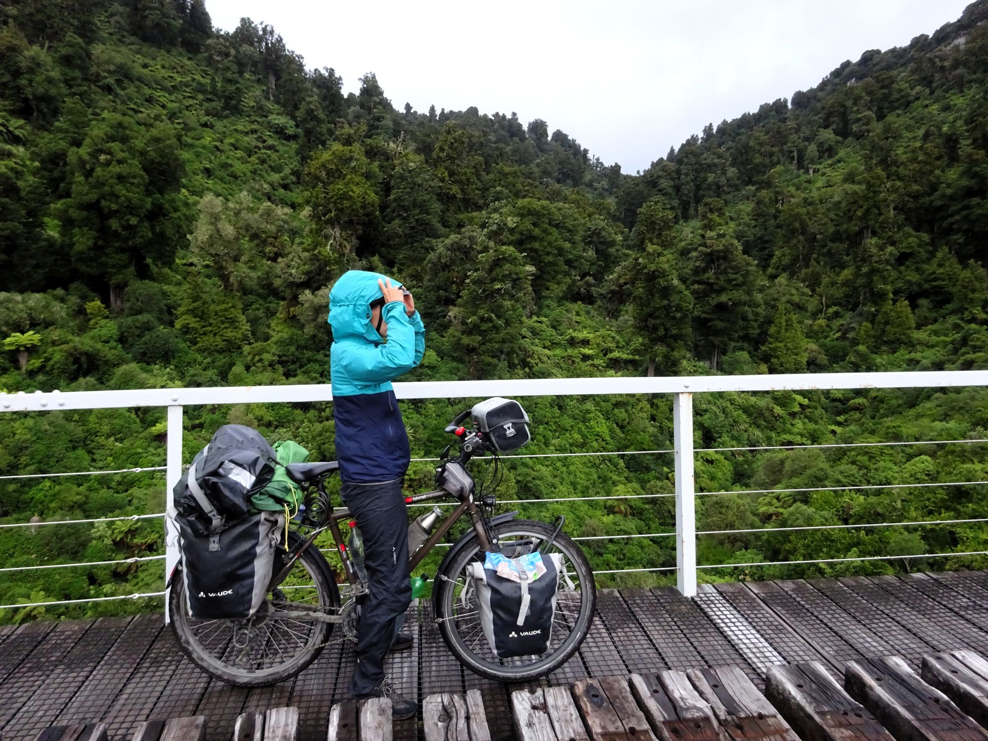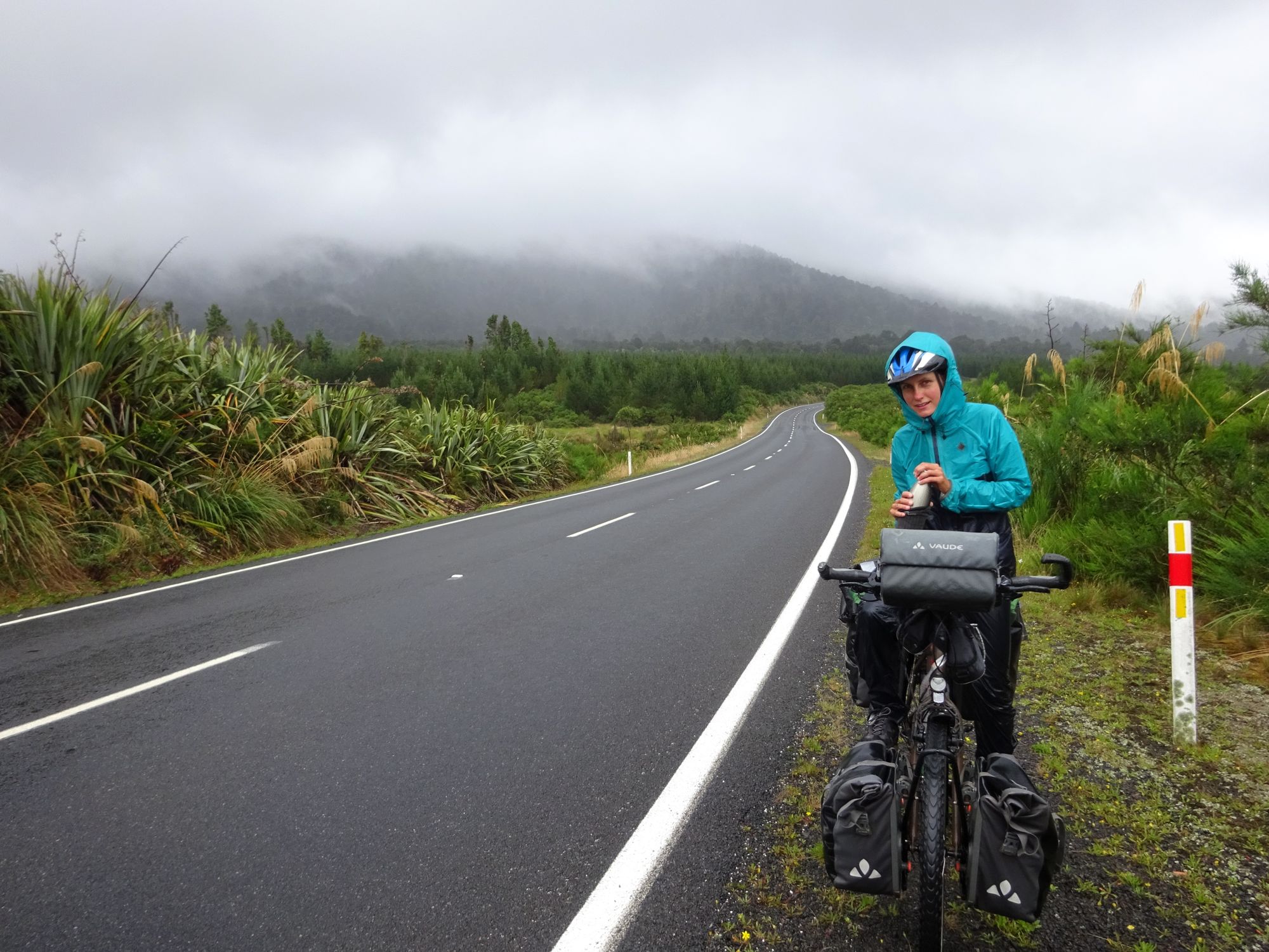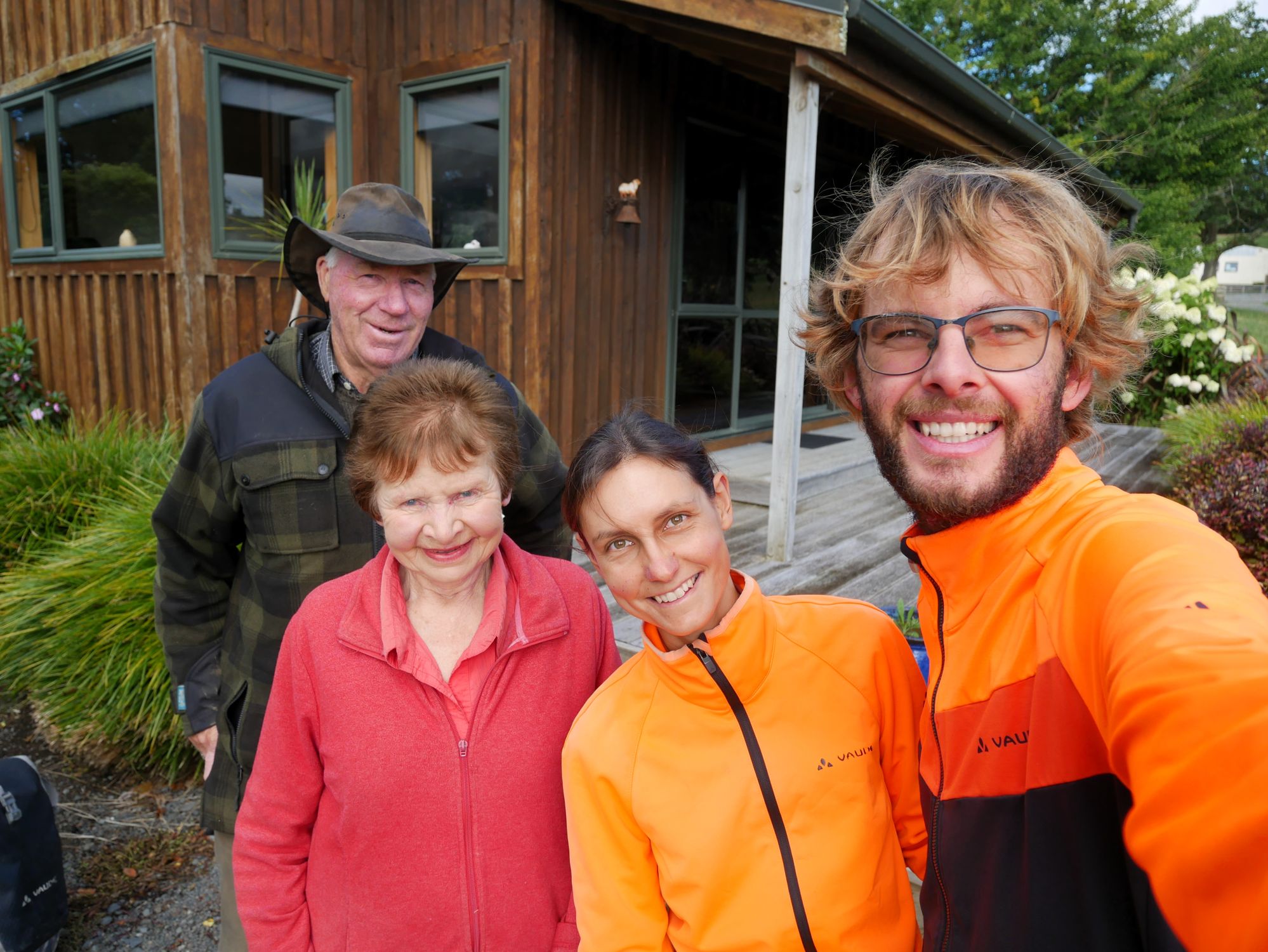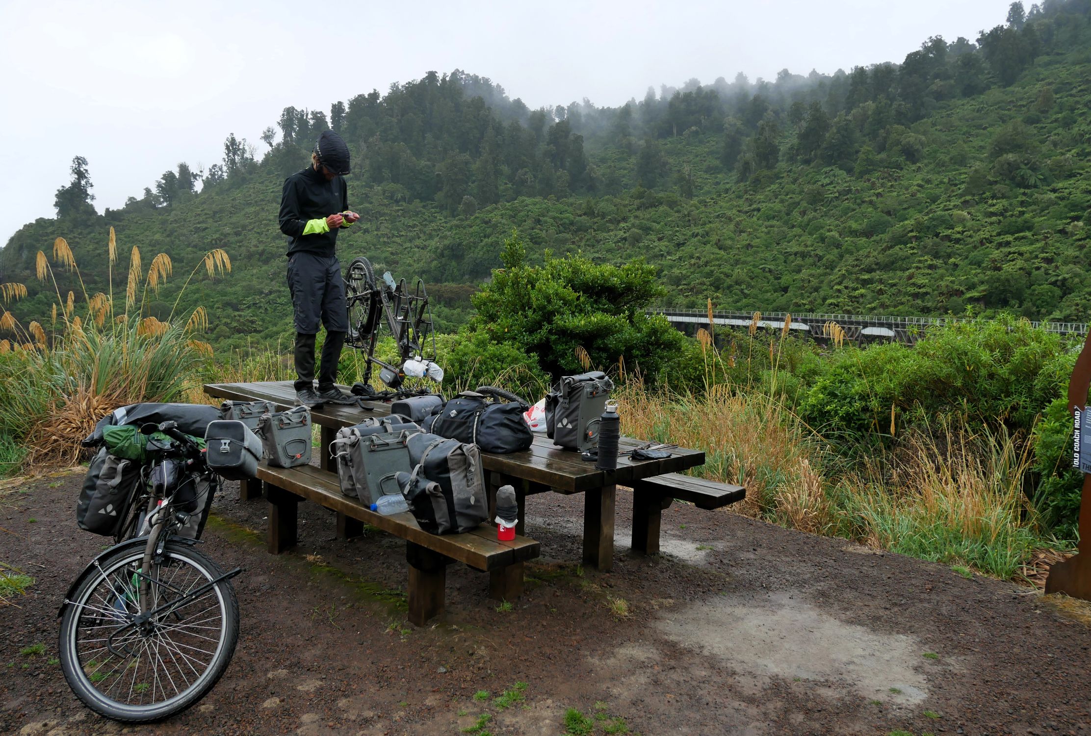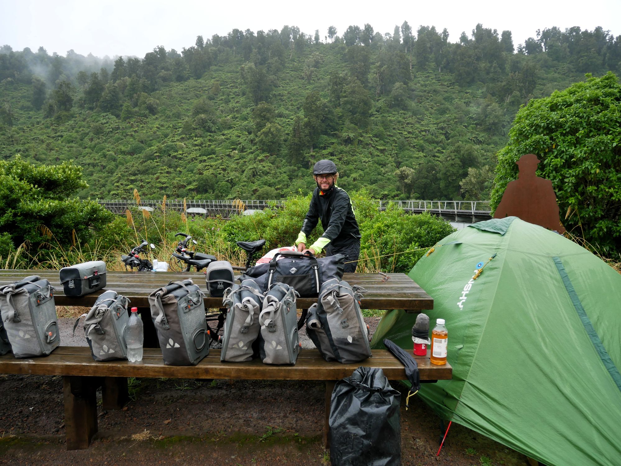 Wir haben noch eine gute Woche Zeit, bevor unsere Fähre auf die Nordinsel geht – und die nutzen wir für einen ausgedehnten Schlenker über die Rainbow Road und Molesworth Route. Es ist ein spektakulärer Umweg in leerem unbewohntem Gebirgsland, durch karge weite Täler, entlang reißender türkiser Flüsse, über kurze aber sehr steile Pässe (darunter auch der höchste Pass Neuseelands) und das alles bei heftigen Sturmböen aus allen Richtungen. Dabei erinnert uns nicht nur die Landschaft, sondern auch die Qualität der Schotterstraßen an unsere Abenteuer in Zentralasien. Im Süden der Nordinsel erreichen wir an einer unscheinbaren Straßenkreuzung den Punkt unserer Tour, der am weitesten von unserem Tourstart am Karlsruher Schloss entfernt ist – ab jetzt geht’s also im Prinzip wieder Richtung Heimat! Ansonsten beschäftigt uns auf der Nordinsel bisher vor allem ein Thema: Regen. In den 10 Tagen seit der Fährüberfahrt haben wir die Sonne kaum gesehen, das Zelt nass einzupacken wird zum Standard. Doch zu unserem Glück werden wir von der neuseeländischen Gastfreundschaft nicht im Stich gelassen.