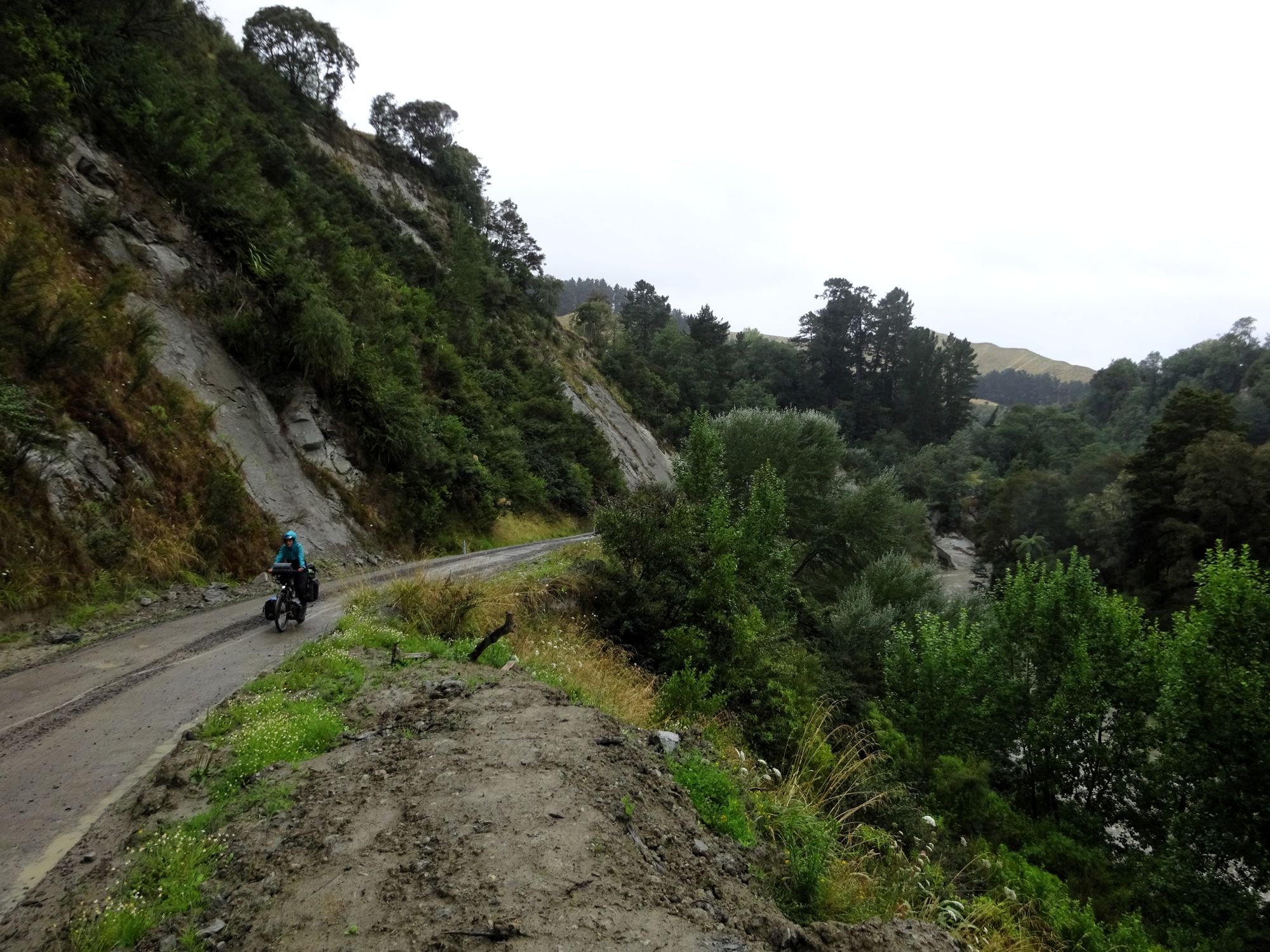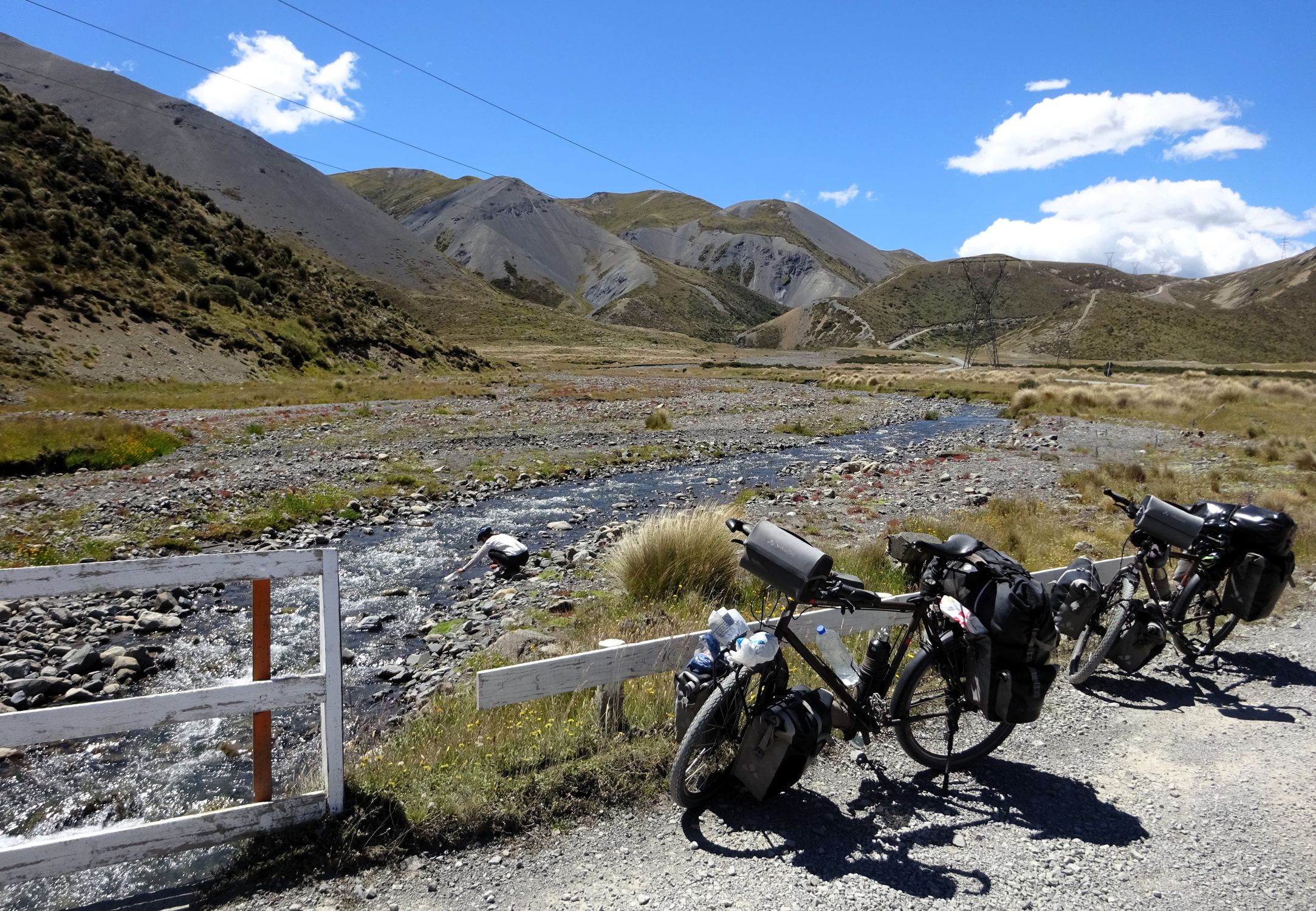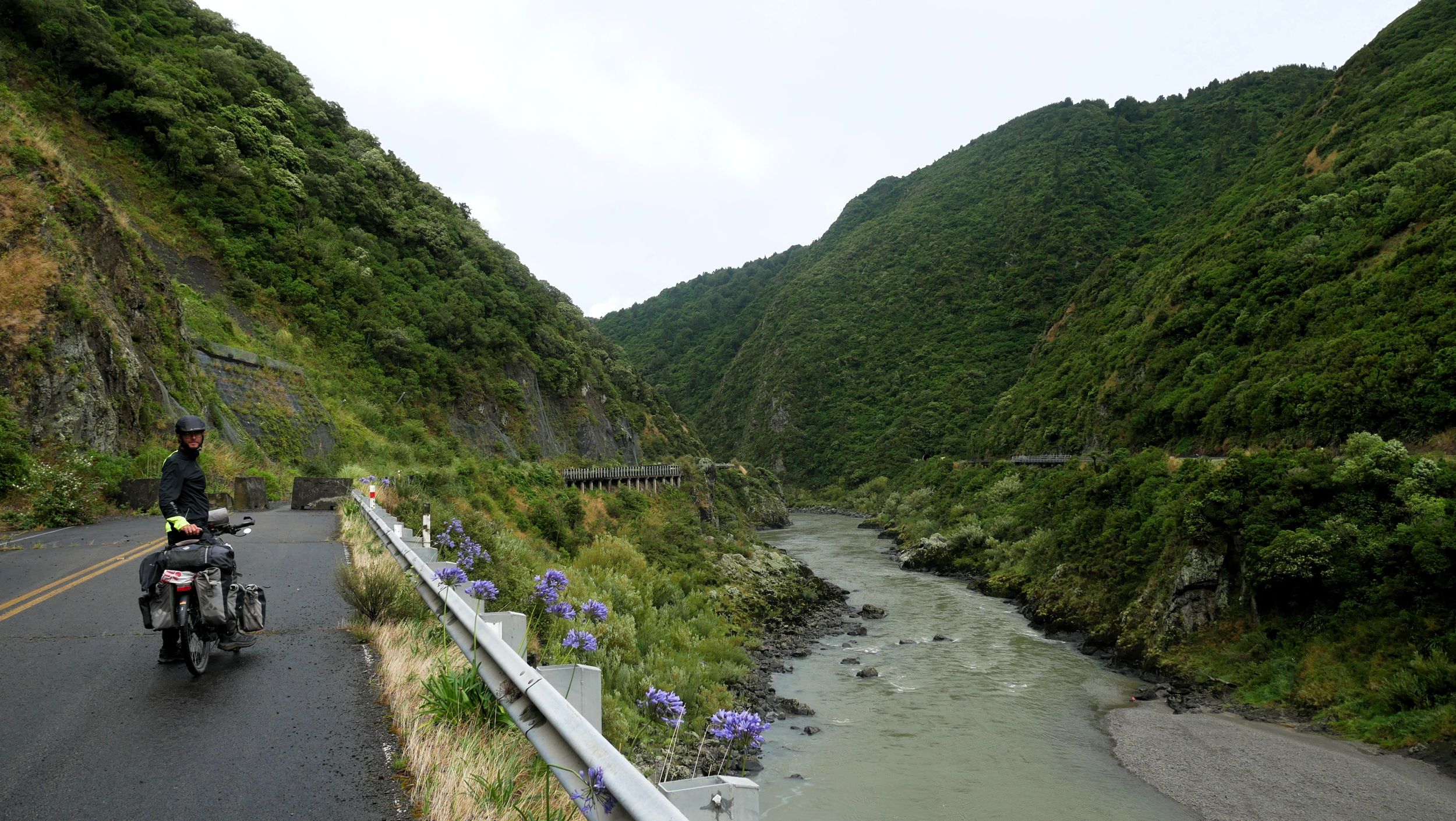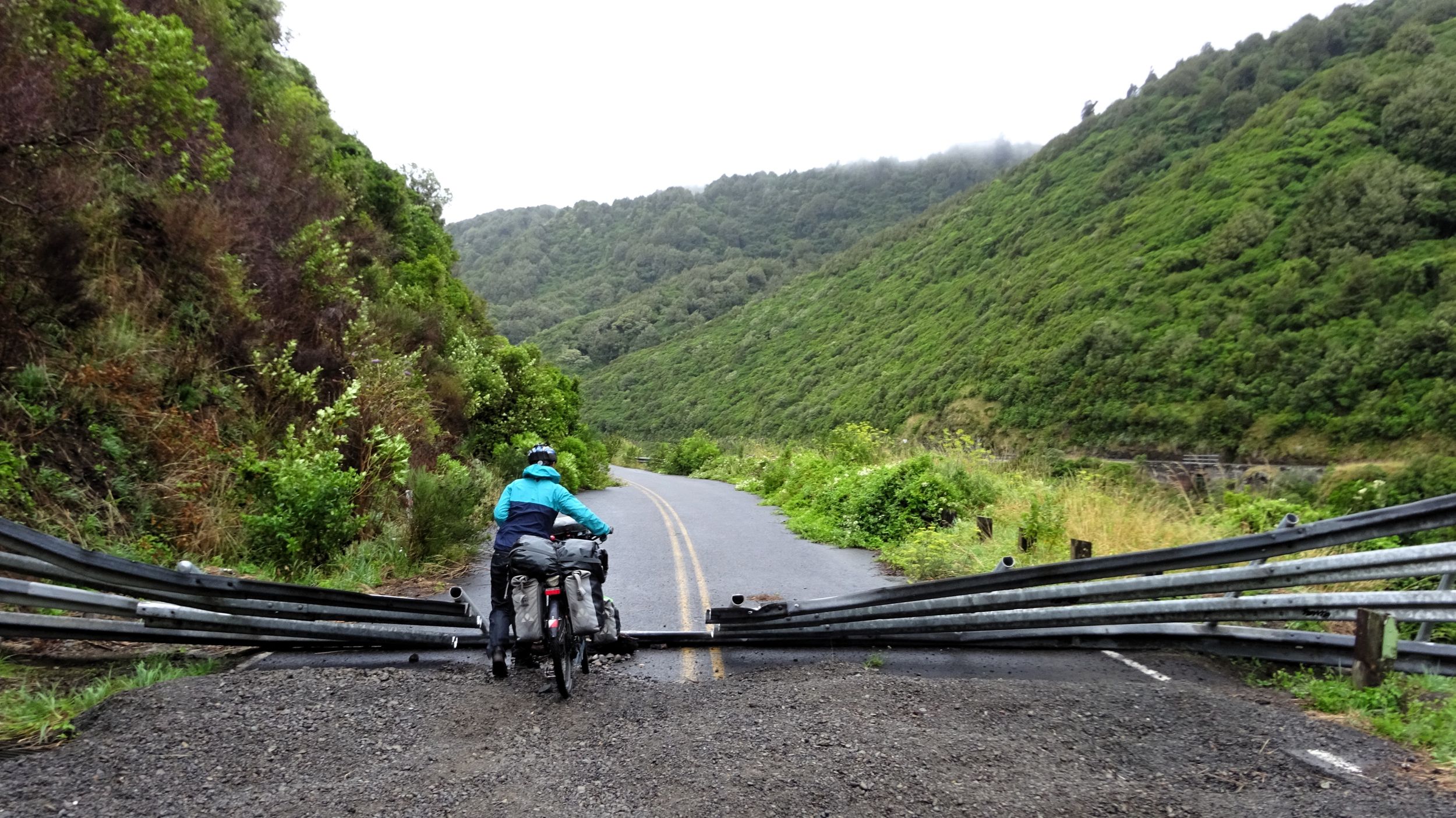 Wir haben noch eine gute Woche Zeit, bevor unsere Fähre auf die Nordinsel geht – und die nutzen wir für einen ausgedehnten Schlenker über die Rainbow Road und Molesworth Route. Es ist ein spektakulärer Umweg in leerem unbewohntem Gebirgsland, durch karge weite Täler, entlang reißender türkiser Flüsse, über kurze aber sehr steile Pässe (darunter auch der höchste Pass Neuseelands) und das alles bei heftigen Sturmböen aus allen Richtungen. Dabei erinnert uns nicht nur die Landschaft, sondern auch die Qualität der Schotterstraßen an unsere Abenteuer in Zentralasien. Im Süden der Nordinsel erreichen wir an einer unscheinbaren Straßenkreuzung den Punkt unserer Tour, der am weitesten von unserem Tourstart am Karlsruher Schloss entfernt ist – ab jetzt geht’s also im Prinzip wieder Richtung Heimat! Ansonsten beschäftigt uns auf der Nordinsel bisher vor allem ein Thema: Regen. In den 10 Tagen seit der Fährüberfahrt haben wir die Sonne kaum gesehen, das Zelt nass einzupacken wird zum Standard. Doch zu unserem Glück werden wir von der neuseeländischen Gastfreundschaft nicht im Stich gelassen.