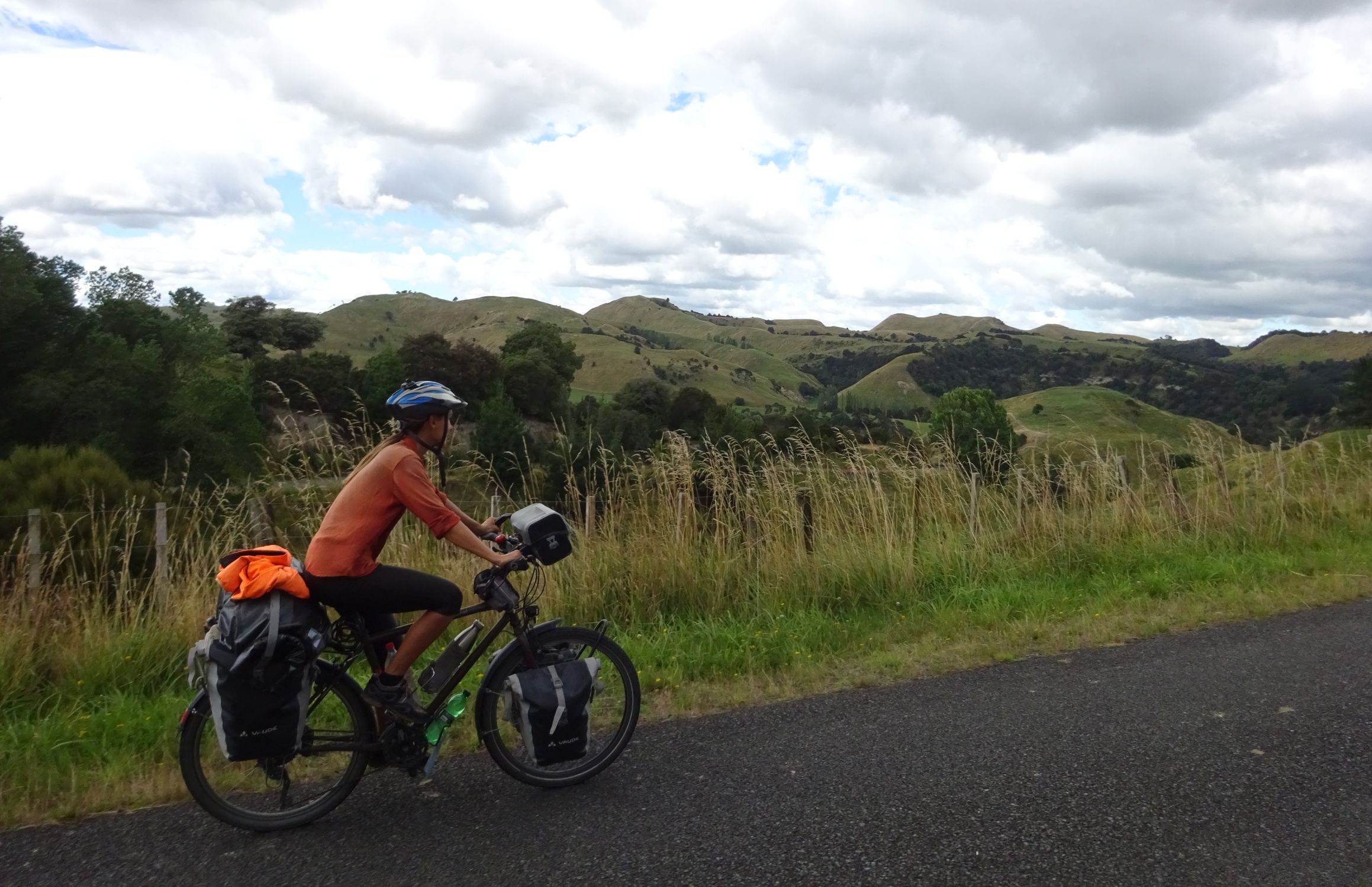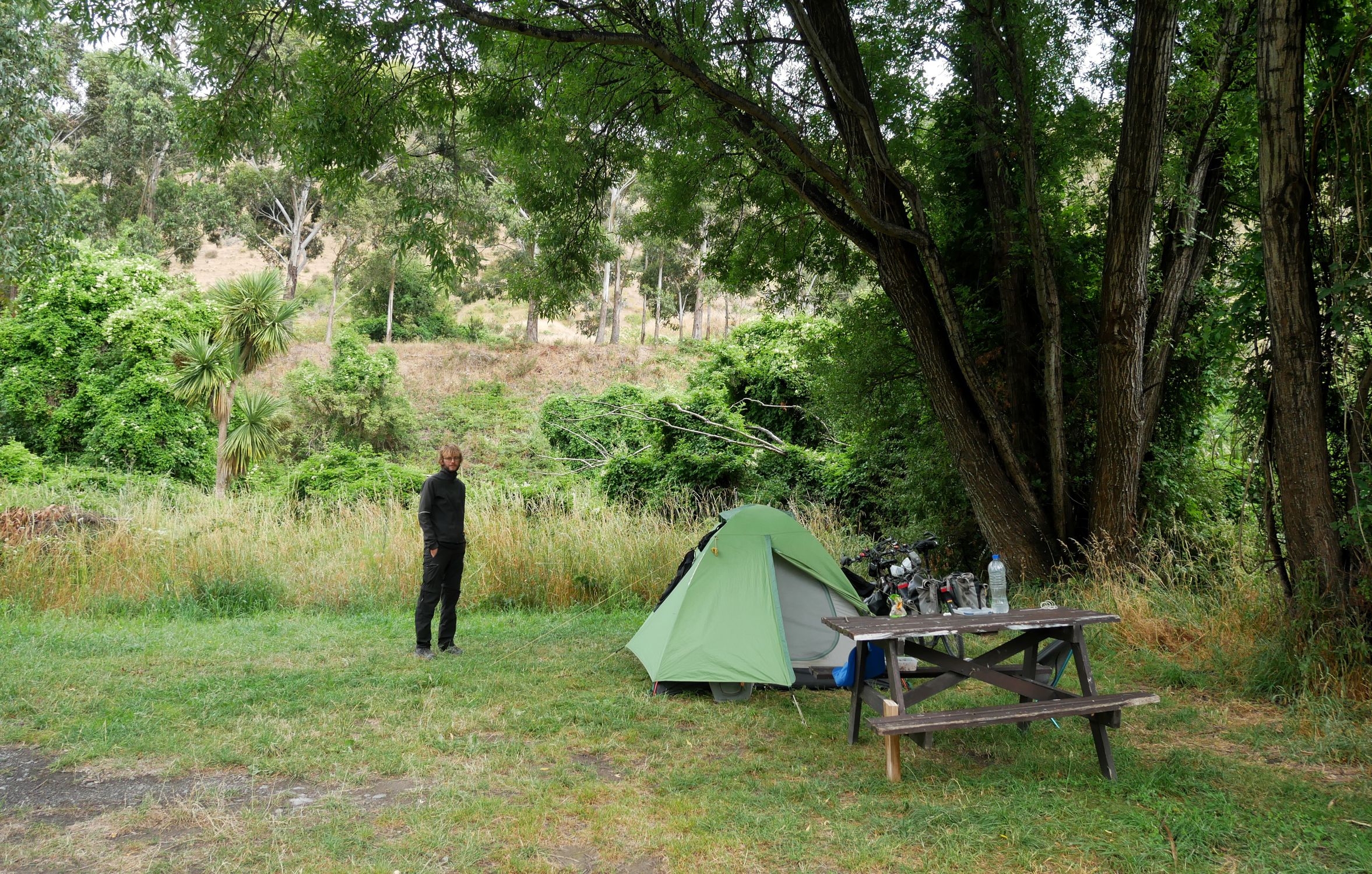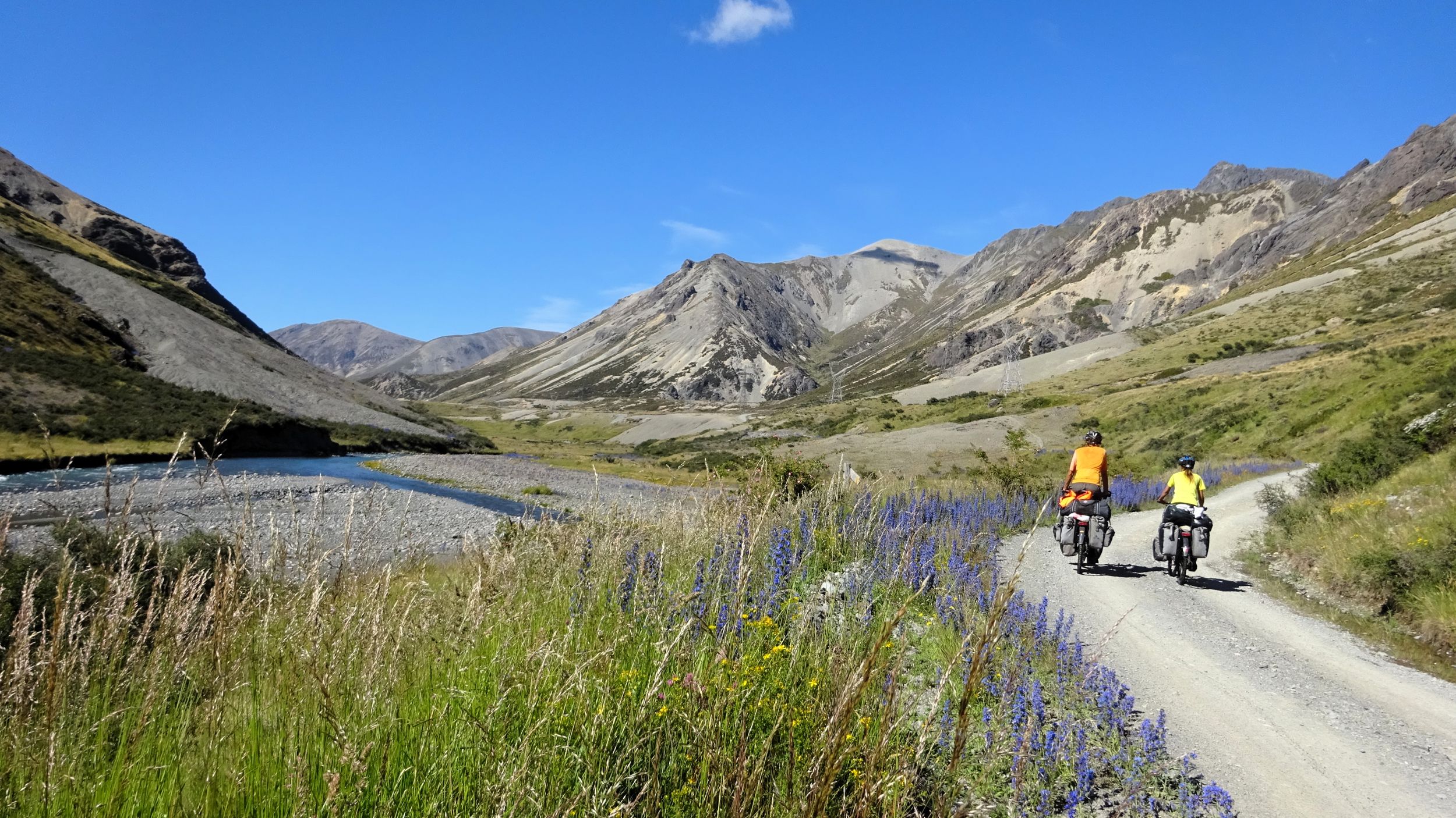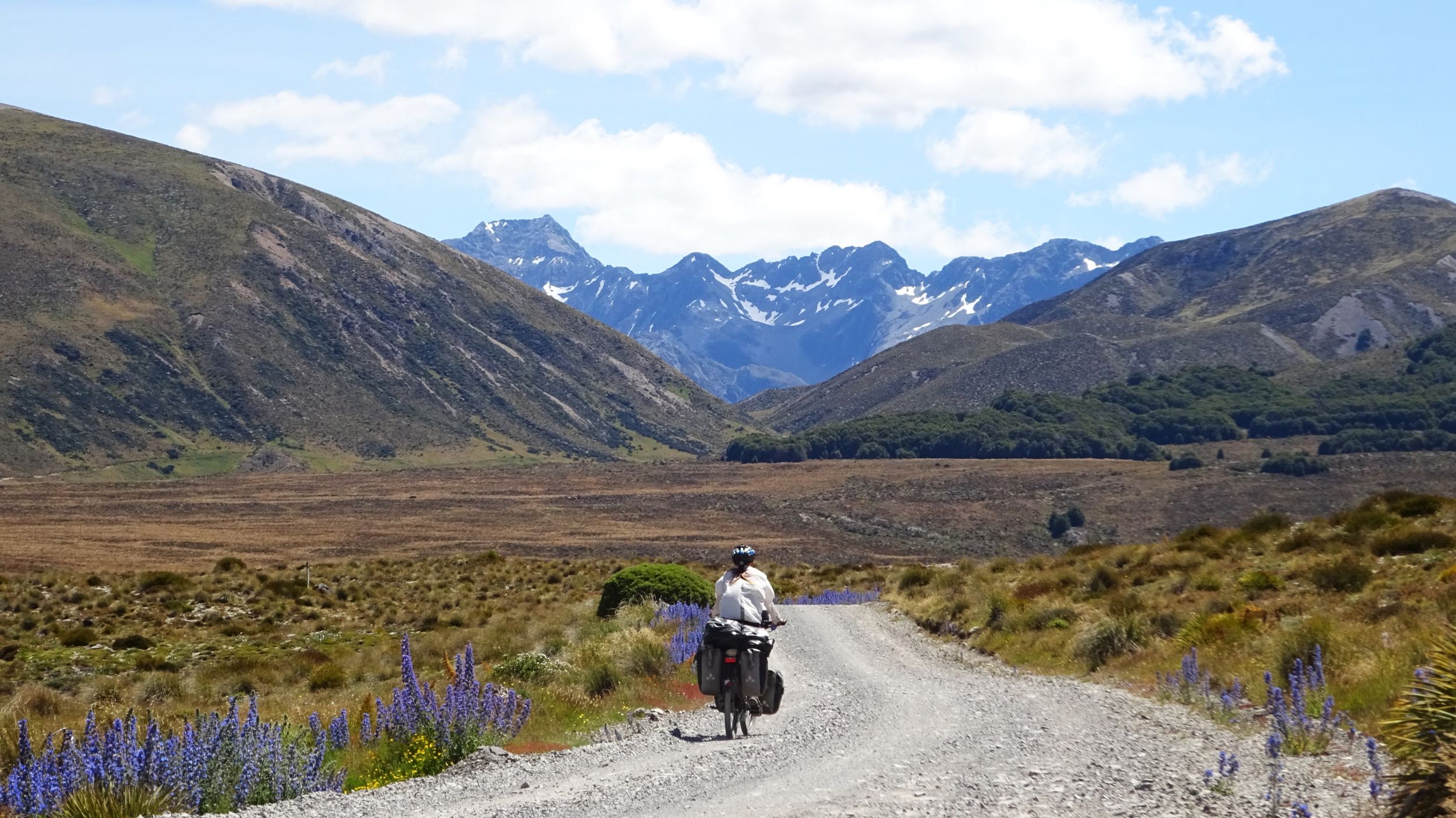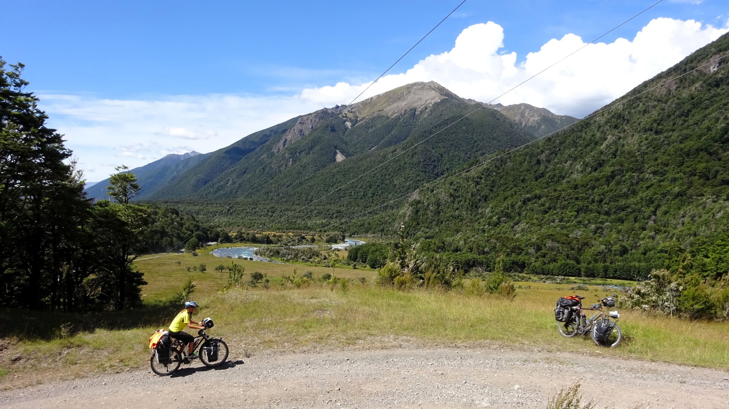 Wir haben noch eine gute Woche Zeit, bevor unsere Fähre auf die Nordinsel geht – und die nutzen wir für einen ausgedehnten Schlenker über die Rainbow Road und Molesworth Route. Es ist ein spektakulärer Umweg in leerem unbewohntem Gebirgsland, durch karge weite Täler, entlang reißender türkiser Flüsse, über kurze aber sehr steile Pässe (darunter auch der höchste Pass Neuseelands) und das alles bei heftigen Sturmböen aus allen Richtungen. Dabei erinnert uns nicht nur die Landschaft, sondern auch die Qualität der Schotterstraßen an unsere Abenteuer in Zentralasien. Im Süden der Nordinsel erreichen wir an einer unscheinbaren Straßenkreuzung den Punkt unserer Tour, der am weitesten von unserem Tourstart am Karlsruher Schloss entfernt ist – ab jetzt geht’s also im Prinzip wieder Richtung Heimat! Ansonsten beschäftigt uns auf der Nordinsel bisher vor allem ein Thema: Regen. In den 10 Tagen seit der Fährüberfahrt haben wir die Sonne kaum gesehen, das Zelt nass einzupacken wird zum Standard. Doch zu unserem Glück werden wir von der neuseeländischen Gastfreundschaft nicht im Stich gelassen.