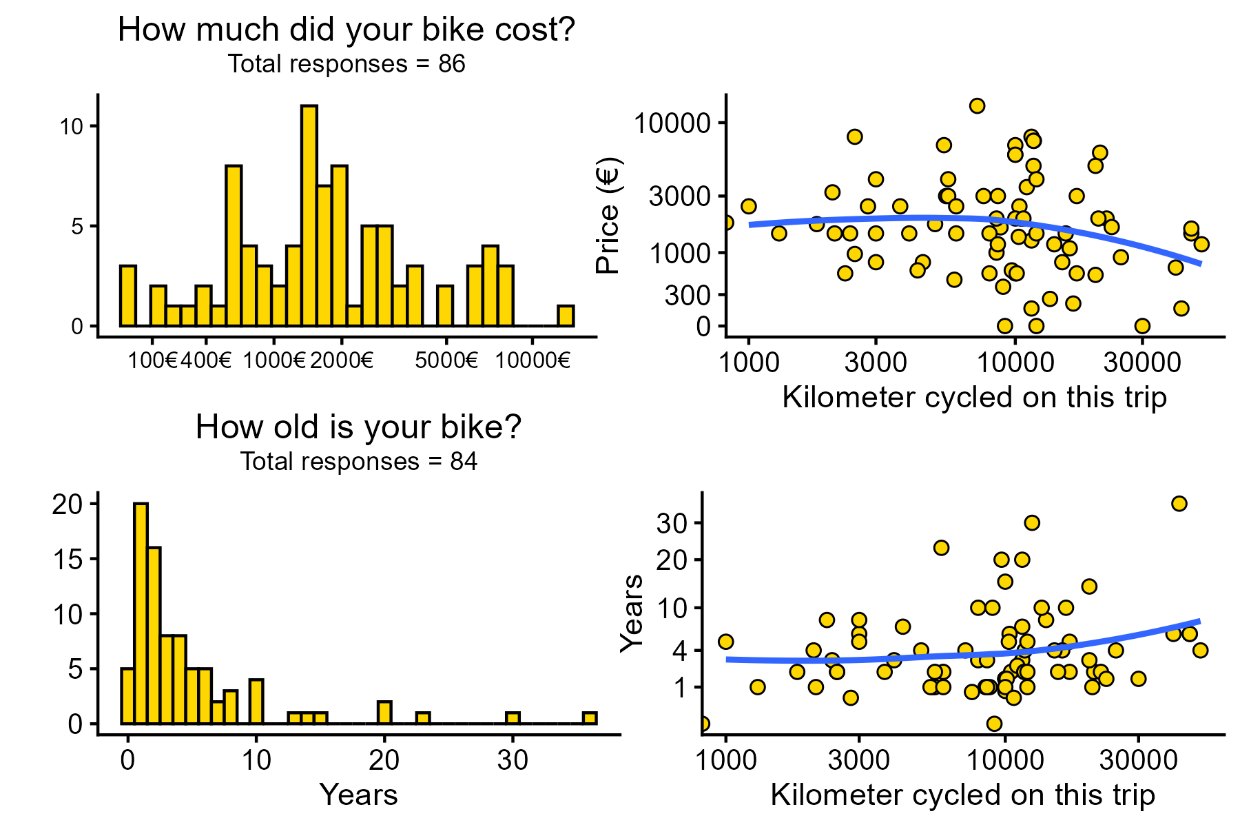 Most bikes cost between 500 and 2000€ (with two peaks at 800 and 1500€) and are younger than 10 years. However, neither the age or price of a bike had any effect in how far participants pedaled.