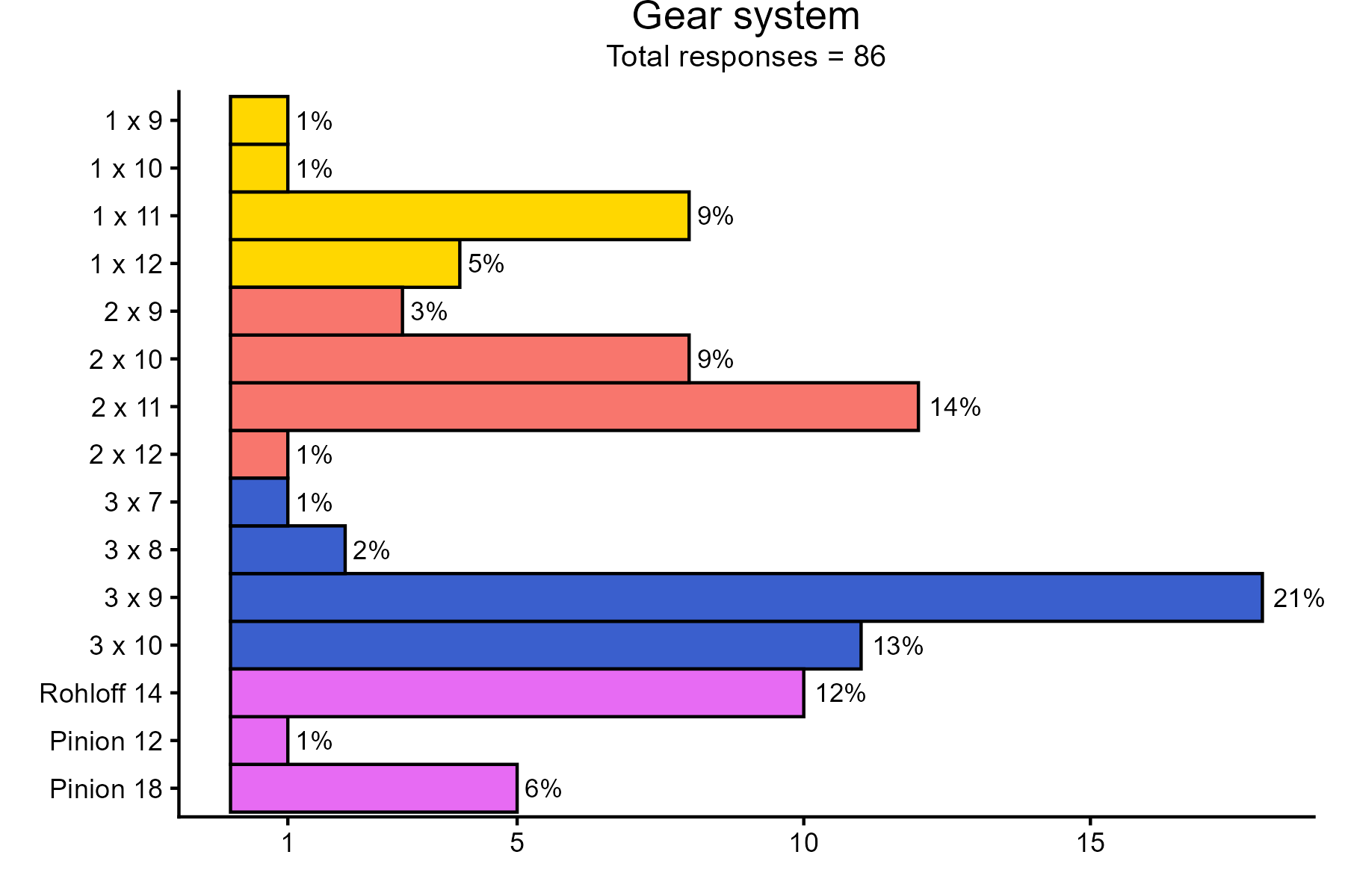 People ride all kind of gear systems. The most common gear system is 3 x 9, followed by 2 x 11, 3 x 10 and Rohloff with 14 gears.