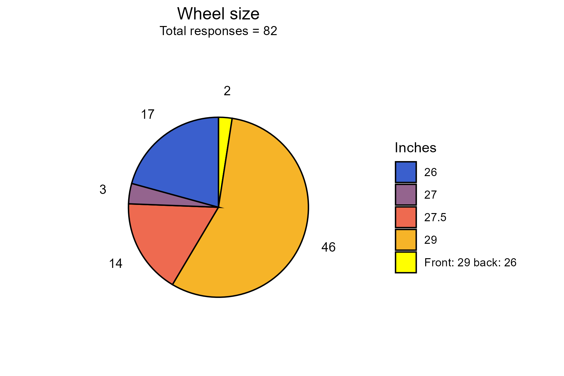 Most bikes have 29” wheels, however 26” and 27.5” are also common.
